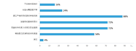 从上图可以看出,在被调查者的眼中打车软件最应该改善是以下这几点:建立严格的司机身份审核机制,加强司机素质的培训,完善软件的准入标准以及安全漏洞。从2016年末至今,网约车新政陆续落地,要求参与网约车运营的人员必须具备网约车驾驶员资格证书。但似乎到如今仍未完成这一条例,在现实中打车软件司机的注册充满了漏洞。