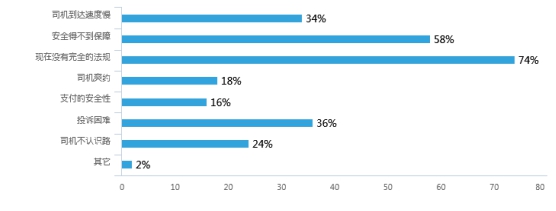 从上图可以看出,被调查者认为目前打车软件最大的缺陷在于现在没有完全的法规,其次为安全得不到保障、投诉困难和司机到达速度慢。可见主要分为两个方面一是安全,二是效率。其实国家对于出租汽车行业(包括专车)已经颁布了许多文件,但对于其的具体落实是否有效和是否全面却仍有疑问。好比是在2017年末上海市交通管理部门要求互联网巡游车打车软件不得设置显示乘客目的地的相关功能。这一条例是否达到了所谓的要求(改善乘客打车体验度,防止驾驶员利用软件挑选业务,体现服务公平,提高服务质量)仍有疑问。所以如何使出租车行业健康发展仍是一个问题。